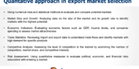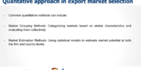 Методи кількісного аналізу включають групування ринків за спільними характеристиками, що дозволяє спрощено оцінювати їхній потенціал. Крім того, використовуються статистичні моделі для прогнозування перспектив як на рівні компанії, так і країни загалом.