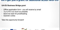 Також під час заходу було повідомлено, що у межах проєкту Business Bridge – Ukraine-Ready4EU до 1 500 українських МСП, які планують конкретні заходи для підвищення своєї активності на Єдиному ринку ЄС та успішної співпраці з бізнес-партнерами з ЄС, а також відповідають критеріям, можуть скористатися фінансовою підтримкою Business Bridge у розмірі 2 500 євро.