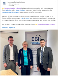 А 31 травня 2023 року в рамках проєкту за співпраці з EU4Business делегація «МКУ» у складі Голови Наглядової Ради ГС «МКУ» Артема Ващиленка та Виконавчої директорки ГС «МКУ» Олени Жукової зустрілася з Філіпом Істхілом, Генеральним секретарем Європейської човнової промисловості (European Boating Industry (EBI) та Рене Берквенсом, Головою Асоціації верфей і морського обладнання Європи (The Shipyards’ & Maritime Equipment Association of Europe (SEA Europe). Зустріч відбулася в Брюсселі на базі Netherlands Maritime Technology.